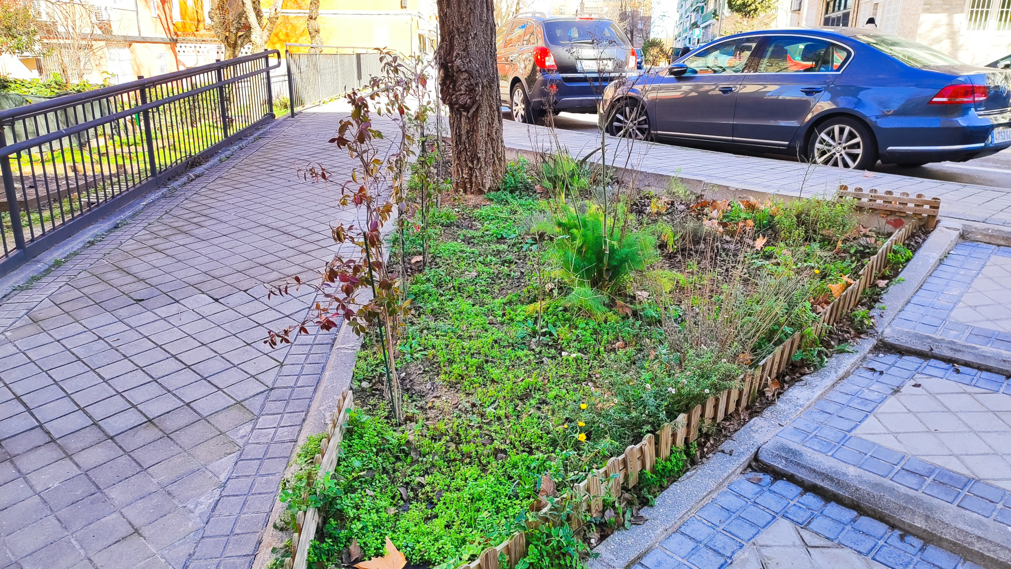A continuación dotó al espacio de volumen instalando una pérgola en el parterre situado frente a la farmacia, que rápidamente comenzó a colonizarse con falsos jazmines.